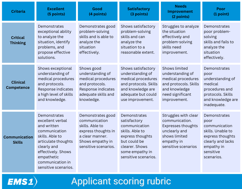 Create a rubric to score applicants’ responses based on the criteria of critical thinking, clinical competence and communication skills.